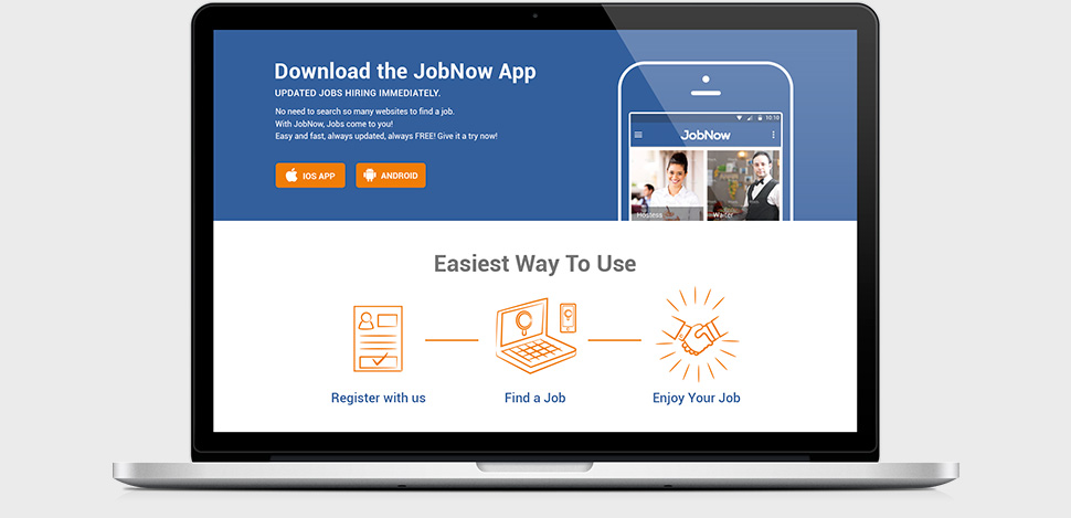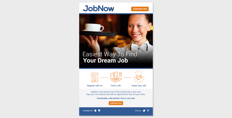 JobNow es una empresa dedicada a la búsqueda de trabajo online situada en Dallas, Estados Unidos. Realizamos el diseño y maquetado de la aplicación web, asesoramiento de imagen y desarrollo de piezas gráficas.